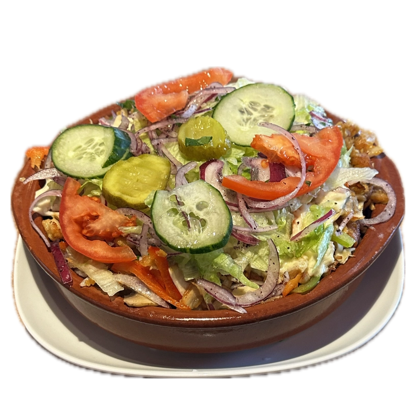 Met friet, frisse salade, gesmolten kaas en saus0