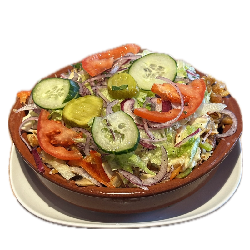 Met friet, frisse salade, champignons, ui, paprika, gesmolten kaas en saus0