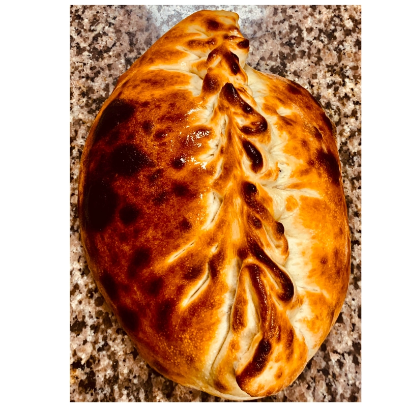 Dichtgevouwen pizza met kipfilet, ui, paprika en champignons0